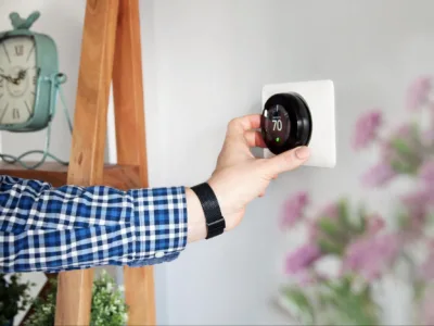 Person adjusting the thermostat in their home