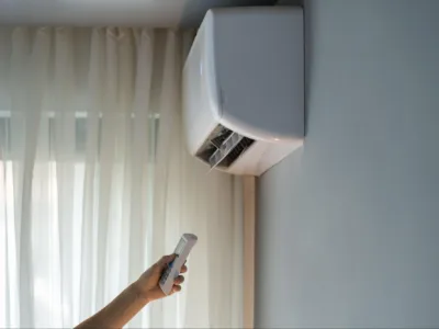 A person's hand is seen pointing a remote at an AC system